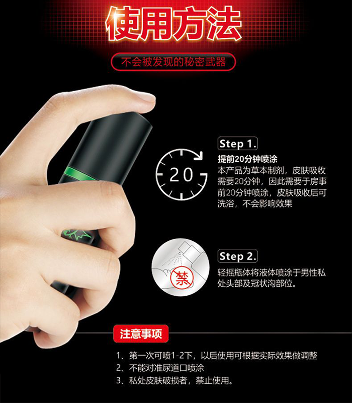 3、不可塗於尿道口處,因尿道口肌膚比較敏感,如噴塗上面有輕微不適感,請用冷水清洗即可。