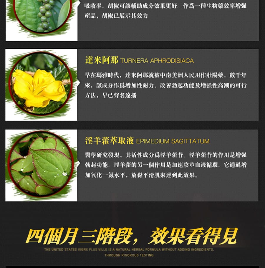 嚴選天然草本成分如胡椒、淫羊藿、達米阿那等,經專業比例調配,效果相輔相成,確保吸收率與效果最大化。