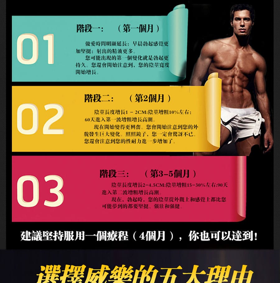 | 第1個月 | 性慾提升,晨勃更堅挺,射精量增多,陰莖逐漸變長 |