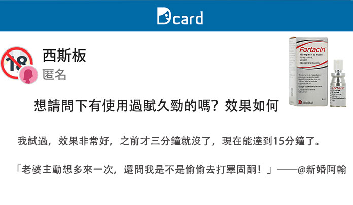 近幾個月,Dcard 上關於「賦久勁 Fortacin 延時噴霧」的討論持續升溫🔥,尤其在西斯板、感情板與醫學板,掀起一波男性延時產品熱潮。從初次使用的學生族、忙碌上班族到已婚男性,許多網友真實分享了使用賦久勁後延長性愛時間、改善表現焦慮、提升自信的轉變。